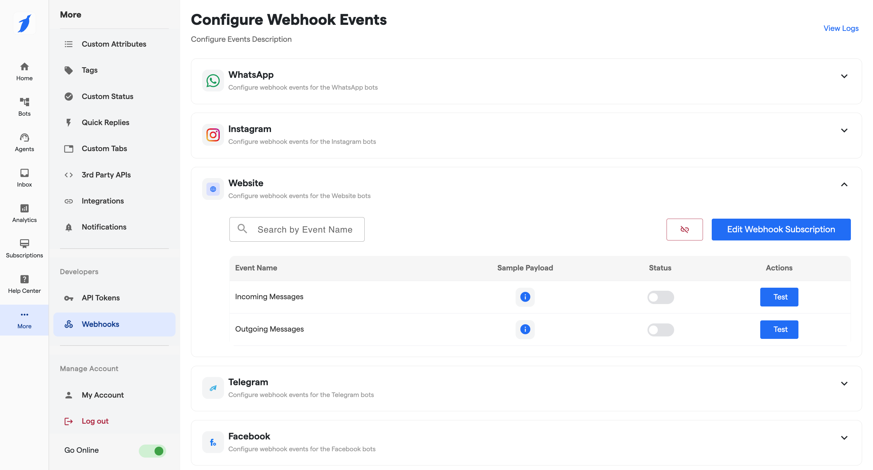 Expanded webhook coverage for social bots, allowing configuration for Website, Telegram, and Facebook channels in addition to Instagram, WhatsApp, and account-level webhooks. This ensures broader connectivity and automation capabilities. 🌐🤖